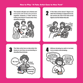 A Fake Artist Goes to New York is a party game for 5-10 players. Players take turns being the Question Master, whose role is to set a category, write a word within that category on dry erase cards, and hand those out to other players as artists. At the same time, one player will have only an "X" written on his card. He is the fake artist!
