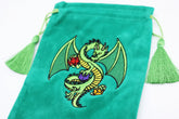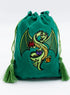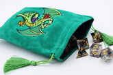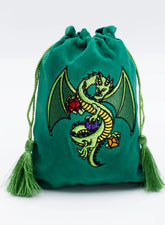 This dice bag is big enough to hold several sets of dice while not being bulky. It has an embroidered design on faux suede with a drawstring closure.