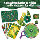 A riddle adventure in the jungle! Working together or by themselves, children ages six and up can solve various riddles to open mysterious treasure chests. In each round, six different types of puzzles, which are shown on 36 illustrated, large-format cards, are combined in new ways. Thus, the game is replayable, offering a new gaming experience in each round. A playful introduction to get young players started in the EXIT: The Game series.