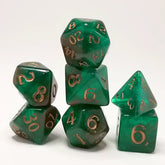 Presenting an earthen brown and translucent green dice with micro glitter and copper inked font.