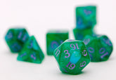 These dice are a witchy dark-green with iridescent glitter, an opaque necro-teal swirl, with lavender font.